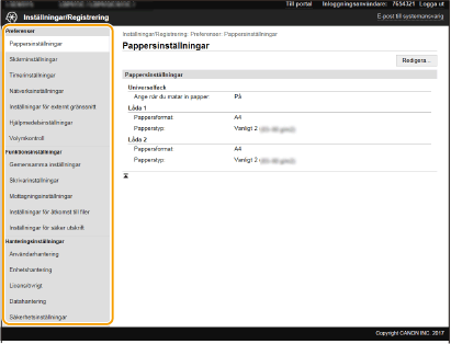 Du kan ändra enhetens olika inställningar från fjärranvändargränssnittet. De flesta inställningar kan också ställas in på enheten, men vissa kan bara ställas in från fjärranvändargränssnittet. I det här avsnittet beskrivs grundläggande åtgärder för att ändra enhetens inställningar från fjärranvändargränssnittet.