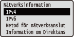 Visar nätverksinställningar, t.ex. enhetens IP-adress och status, t.ex. den trådlösa nätverkskommunikationens kondition.