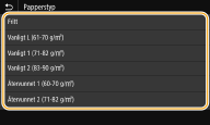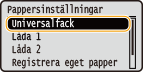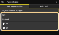 När du har registrerat standardpappersinställningar visas inställningsskärmen inte när du fyller på papper och samma inställningar används varje gång. Om du fyller på andra pappersformat eller papperstyper utan att ändra pappersinställningar blir utskrifterna kanske inte bra. För att undvika detta problem väljer du <Ange när du matar in papper> i steg 3 och fyller därefter på papper.