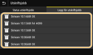 Välj det dokument vars logg du vill kontrollera.<OK> visas när ett dokument har skrivits ut, och <Fel> visas när ett dokument inte har skrivits ut på grund av att åtgärden har avbrutits eller ett fel har uppstått.