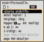 Det går att skriva ut 9 eller 16 sidor med bilddata i en PDF-fil på en sida av ett pappersark genom att använda <N på 1> under <Ange PDF-detaljer>.