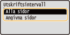 <Angivna sidor> Ange intervallet med sidor som du vill skriva ut. Ange sidnummer i <Första sidan> och <Sista sidan> med sifferknapparna och välj <Använd>.