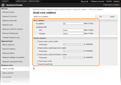 Uložte ID oddělení a nastavte pro ně kód PIN. Uložte všechna ID oddělení, která chcete spravovat.