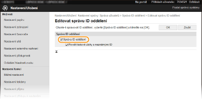 Zaškrtnutím políčka aktivujete správu ID oddělení. Pokud funkci správy ID oddělení nechcete dále používat, zrušte zaškrtnutí políčka.