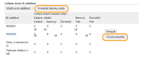 Chcete-li nastavit počet opět na nulu, klikněte na příslušný textový odkaz pod [ID oddělení] a klikněte na [Vynulovat počty] /b_key_arrow_right.gif) [OK]. Chcete-li nastavit počet na nulu pro všechna ID oddělení, klikněte na [Vymazat všechny počty] /b_key_arrow_right.gif) [OK].