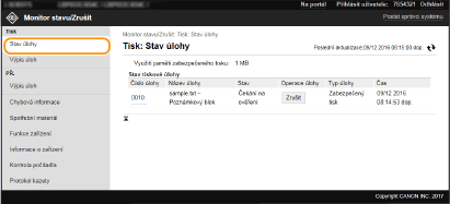 U pozastavených a zabečených dokumentů kliknutím na tlačítko [Číslo úlohy] zobrazíte podrobné informace. Můžete zkontrolovat uživatelské jméno a počet stránek vytištěného dokumentu.
