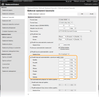 *Pokud nelze napájení vypnout automaticky v zadaném čase, provede se v intervalu po jedné minutě opakovaný pokus, a to až desetkrát. Pokud nelze napájení vypnout ani po deseti opakovaných pokusech, automatické vypnutí v daném dnu se neprovede.
