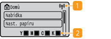 Zbývající množství toneru v tonerových kazetáchUkazuje zbývající množství toneru v kazetách ve fázích. Je-li obrazovka Domů aktivní, jsou tyto hodnoty skryté.