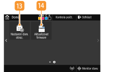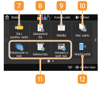 <Monitor stavu>Po stisknutí tohoto tlačítka můžete zkontrolovat stav tisku, zobrazit historii používání nebo síťová nastavení, jako je adresa IP zařízení. Můžete také ověřit stav zařízení, např. zbývající množství papíru a zbývající množství toneru v kazetách nebo chyby, ke kterým případně došlo. Obrazovka <Monitor stavu>
