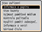 Zobrazí stav zařízení, např. množství papíru nebo zbývající množství toneru v kazetách.