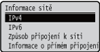 Zobrazuje nastavení sítě, jako je adresa IP zařízení, a stav, například komunikací v bezdrátové síti LAN.