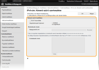 Ha helytelen IP-címeket adott meg, előfordulhat, hogy nem fog tudni hozzáférni a készülékhez a Távoli felhasználói felületről. Ebben az esetben az <IPv4-címszűrés> vagy az <IPv6-címszűrés> beállítást <Ki>.