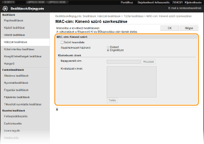 Ha helytelen MAC-címeket ad meg, előfordulhat, hogy nem fog tudni hozzáférni a készülékhez a Távoli felhasználói felületről. Ebben az esetben a <MAC-cím szűrő> beállítást a <Ki> értékre kell állítani. <MAC-cím szűrő>