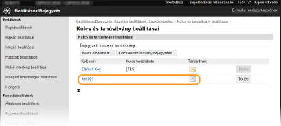 Ha a kulcsot és a tanúsítványt valamelyik funkció használja, ha például a „[TLS]” vagy az „[IEEE 802.1X]” felirat látható a [Kulcs használata] mezőben, a kulcs és a tanúsítvány nem törölhető. Ebben az esetben a kulcs törlése előtt ki kell kapcsolni a funkciót, vagy le kell cserélni a kulcsot és a tanúsítványt.