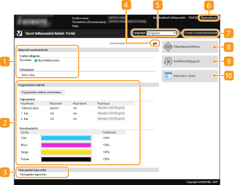 Megjeleníti a készülék aktuális állapotát és a hibainformációkat. Ha hiba történt, akkor megjelenik a Hibainformációk oldalra mutató hivatkozás.