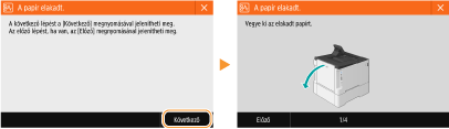 Amikor hiba lép fel, bizonyos esetekben a hiba elhárítására vonatkozó útmutatás jelenik meg a kijelzőn. A probléma megoldásához kövesse a kijelzőn látható utasításokat. Az alábbi ábrán például a papírelakadáskor megjelenő képernyő látható.