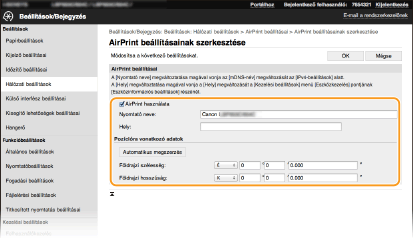 Bejegyezheti a készülék nevét és telepítési helyét, amelyet a készülék azonosítására használhat, valamint más hasonló információkat. A készüléken le is tilthatja az AirPrint funkciót. Ezeket a beállításokat a Távoli felhasználói felületen módosíthatja.