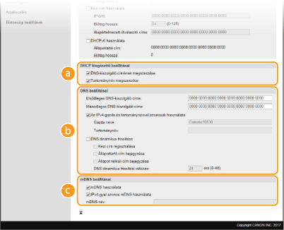 Ha bejelöli a jelölőnégyzetet, akkor a készülék dinamikusan frissíti a DNS-rekordokat, amikor megváltozik az IP-címe. A [Kézi cím regisztrálása], [Állapottartó cím bejegyzése] és [Állapot nélküli cím bejegyzése] jelölőnégyzetek közül a megfelelők bejelölésével adja meg a DNS-kiszolgálón bejegyezni kívánt címtípusokat. A frissítések időközének megadásához írjon be egy időtartamot órákban a [DNS dinamikus frissítési időköze] szövegmezőbe. [mDNS beállításai][mDNS használata]