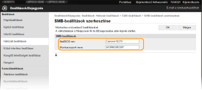 Az SMB (Server Message Block) egy protokoll, amellyel erőforrások, például fájlok és nyomtatók oszthatók meg egy hálózaton több eszköz között. Arra kell használnia, hogy konfigurálja a készüléket megosztott nyomtatóként egy SMB-hálózaton. A hálózattól függően előfordulhat, hogy be kell állítania a NetBIOS nevet és munkacsoportnevet.