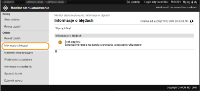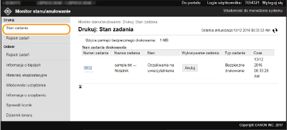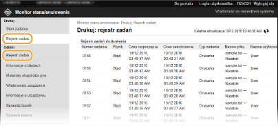 Kliknij opcję [Numer zadania] na dokumentach o wstrzymanym statusie drukowania oraz dokumentach chronionych w celu uzyskania szczegółowych informacji. Można sprawdzić nazwę użytkownika i liczbę stron drukowanego dokumentu.
