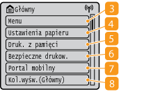 <Menu>Za pomocą tego przycisku można uzyskać dostęp do różnych ustawień urządzenia, takich jak <Ustawienia funkcji> i <Ustawienia>. Lista menu ustawień