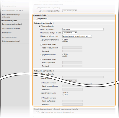Jeśli włączone są obie wersje protokołu SNMP, zalecane jest wybranie w ustawieniach uprawnień dostępu do obiektów menedżera MIB dla protokołu SNMPv1 opcji [Tylko do odczytu]. Uprawnienia dostępu do obiektów menedżera MIB dla protokołów SNMPv1 i SNMPv3 można ustalać oddzielnie (a także osobno dla każdego użytkownika w przypadku protokołu SNMPv3). Wybranie opcji [Odczyt/zapis] (uprawnienie pełnego dostępu) dla protokołu SNMPv1 anuluje wydajne funkcje zabezpieczeń protokołu SNMPv3, ponieważ większością ustawień urządzenia można wtedy zarządzać za pomocą protokołu SNMPv1.