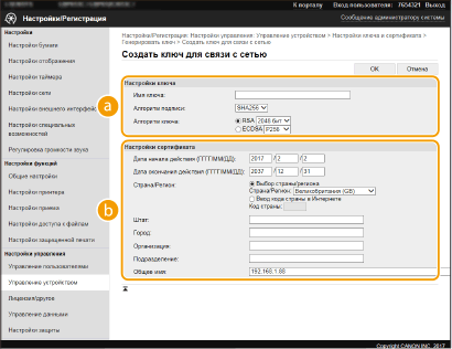 Ключ и сертификат можно создать с помощью аппарата, если они требуются для шифрованной связи по протоколу TLS. TLS можно использовать при доступе к аппарату из Удаленного ИП. Самозаверенные сертификаты используются с ключом и сертификатом, созданными в пункте «Связь с сетью».
