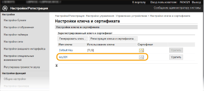 Ключ и сертификат невозможно удалить, если они в настоящее время используются в каких-либо целях, например, если в разделе [Использование ключа] отображается «[TLS]» или «[IEEE 802.1X]». В этом случае отключите функцию или замените ключ и сертификат перед их удалением.