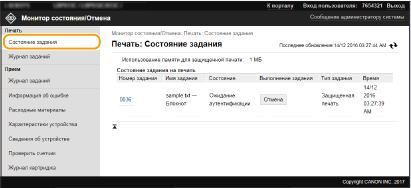 Нажмите [Номер задания] на документах, печать которых была приостановлена, или для которых используется безопасная печать, чтобы просмотреть подробную информацию. Можно просмотреть имя пользователя и количество страниц печатаемого документа.