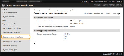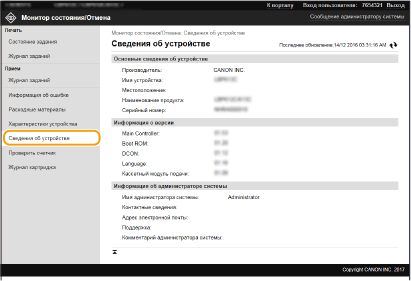 Отображение сведений об аппарате и администраторе системы. Здесь отображаются имя устройства и другие сведения для администратора системы в соответствии с настройками в пункте [Информация об администраторе системы] на странице [Управление пользователями] или в [Настройки сведений об устройстве] на странице [Управление устройством].