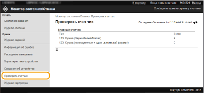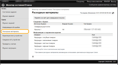 Отображение формата и типа бумаги для источника бумаги, номера модели картриджа с тонером и других сведений. Для отображения этой страницы можно также нажать кнопку [Проверить сведения о расходных материалах] на странице портала (главной странице) (