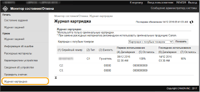 Можно проверить журналы картриджей с тонером и другие журналы. Индикацию можно изменить для картриджей с тонером каждого цвета.