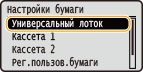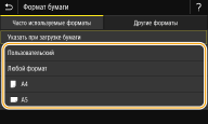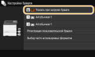 После регистрации параметра бумаги по умолчанию экран параметров бумаги не отображается при загрузки бумаги и всегда используется один и тот же параметр. Если загрузить другой размер или тип бумаги без изменения параметров бумаги, аппарат может не печатать надлежащим образом. Во избежание этой проблемы выберите <Указать при загрузке бумаги> на шаге 3, затем загрузите бумагу.