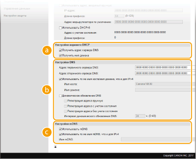 Установите флажок для динамического обновления записей DNS при каждом изменении IP-адреса аппарата. Чтобы задать типы адресов, которые необходимо зарегистрировать для DNS-сервера, установите этот флажок для [Регистрация адреса вручную], [Регистрация адреса с учетом состояния] или [Регистрация адреса без учета состояния]. Чтобы указать интервал между обновлениями, задайте значение времени в текстовом поле [Интервал динамического обновления DNS]. [Настройки mDNS][Использовать mDNS]