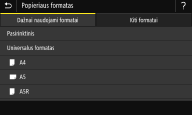 ![]() ![]() Jeigu užregistruojate dažnai naudojamo popieriaus formatą naudodami mygtukus <S1>–<S3>, galite iškviesti juos vienu lietimu. Pasirinktinio popieriaus formato registravimas