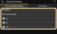 Jei įdėjus popieriaus anksčiau pavaizduotas ekranas nerodomasJeigu į universalųjį dėklą visuomet dedate tokį patį popierių, popieriaus nustatymo veiksmus galite praleisti įregistravę popieriaus formatą ir tipą kaip numatytąjį parametrą. Įregistravus numatytąjį parametrą, anksčiau pavaizduotas ekranas nerodomas. Jei norite matyti ekraną, pasirinkite <Nurodykite, kada popierius įdedamas> (Universaliojo dėklo numatytųjų popieriaus parametrų registravimas).