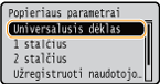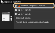 Jei numatytieji popieriaus parametrai įregistruoti, įdėjus popieriaus, parametrų ekranas nerodomas ir visada naudojami tie patys parametrai. Jei įdedate kitokio formato arba tipo popierių ir nepakeičiate parametrų, aparatas gali spausdinti netinkamai. Norėdami išvengti šios problemos, atlikdami 3 veiksmą pasirinkite <Nurodykite, kada popierius įdedamas>, tada įdėkite popierių.