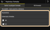 ![]() ![]() Jeigu užregistruojate dažnai naudojamo popieriaus formatą naudodami mygtukus <S1>–<S3>, galite iškviesti juos vienu lietimu. Pasirinktinio popieriaus formato registravimas