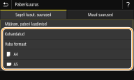 Pärast paberi vaikeseadete salvestamist ei kuvata paberi asetamisel paberi määramise kuva ja alati kasutatakse sama seadet. Kui asetate seadmesse muus formaadis või muud tüüpi paberi paberiseadeid muutmata, ei pruugi seade õigesti printida. Selle probleemi vältimiseks valige 3. juhises <Määram. paberi laadimisel> ja seejärel sisestage paber.