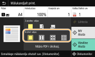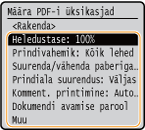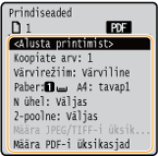 PDF-faili korral saate printida paberi ühele poolele 9 või 16 leheküljel olevad pildiandmed, kasutades sätet <N ühel> üksuses <Määra PDF-i üksikasj.>.