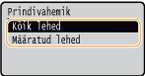 <Määratud lehed> Määrake lehekülgede vahemik, mille soovite printida. Sisestage numbriklahvide abil sobiv väärtus nii väljale <Esimene leht> kui väljale <Viimane leht> ja valige <Rakenda>.