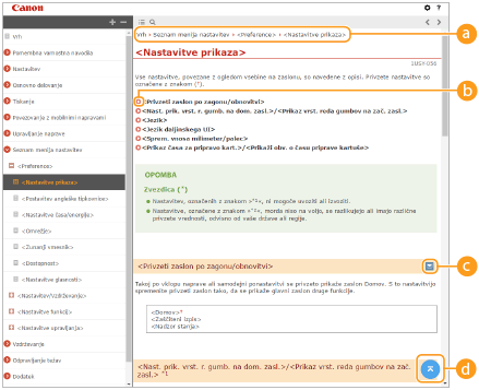 Kliknite nabor parametrov, da določite, kako bo prikazan priročnik Navodila za uporabo, npr. velikost znakov ali postavitev.