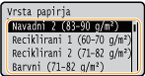Velikosti papirja, ki jih registrirate po zgoraj opisanem postopku, so prikazane na zaslonu za izbiro velikosti papirja za kaseto za papir ali večnamenski podstavek.