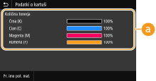 Prikaže preostalo količino tonerja v kartušah. Življenjska doba drugih notranjih delov se lahko izteče, še preden zmanjka tonerja.