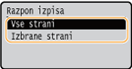 <Izbrane strani> Navedite obseg strani, ki jih želite natisniti. S številskimi tipkami vnesite želeno vrednost za posamezno možnost <Prva stran> in <Zadnja stran>, nato pa izberite <Uporabi>.