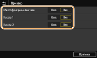 Винаги задавайте <Вкл.> поне за <Касета 1> или <Касета 2>. Ако зададете <Изкл.> и за двете, няма да можете да завършите процедурата за настройка.