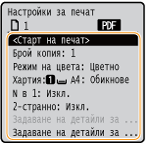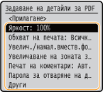 За PDF файл можете да отпечатате 9 или 16 страници с данни за изображения върху едната страна на лист хартия, като използвате <N в 1> за <Задав. на дет. за PDF>.