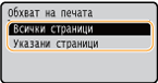 <Указани страници> Изберете диапазона от страници, които искате да отпечатате. Въведете желаната стойност за <Първа страница> и за <Последна страница> с помощта на бутоните с цифри, след което изберете <Прилагане>.