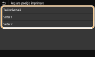 Puteţi utiliza <Setări funcţii> în meniul de setări de pe panoul de operare pentru a ajusta poziţia de imprimare pentru toate lucrările de imprimare, indiferent de sursa de hârtie. Poziţia de imprimare poate fi ajustată în incremente de 0,5 mm între -50,0 mm şi +50,0 mm. <Decalare muchie scurtă/Decalare muchie lungă>