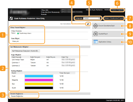 Uzak Kullanıcı Arabiriminde oturum açtığınızda, aşağıdaki Portal sayfası görüntülenir. Bu bölümde, Portal sayfasında görüntülenen öğeler ve temel işlemler açıklanmaktadır.